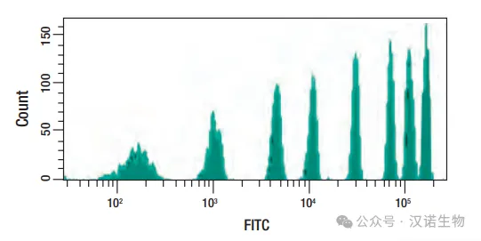 这是否意味着,在较暗的微球组中,有些微球含有较多的荧光团,而有些微球含有较少的荧光团,从而导致更高的变异性?事实并非如此。虽然较暗的峰的 CV 值确实较高,但该组内的每个球内部的染料量基本相同。