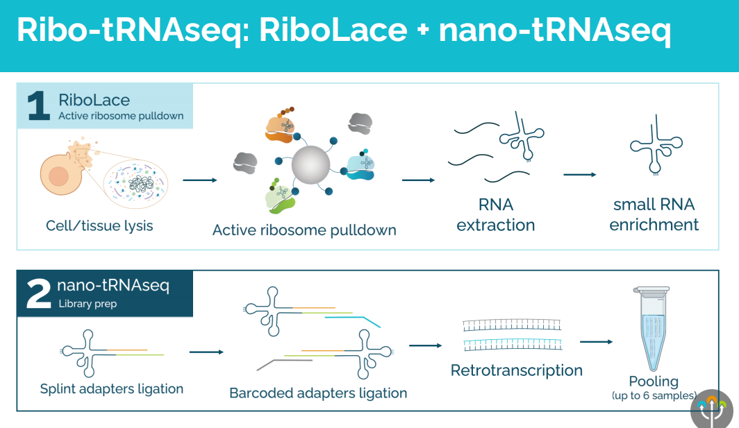 RiboLace 可以将Active Robosome分离来,对核糖体保护片断(RPF)进行纯化、建库,再进行测序,揭示 基因哪些基因正处于翻译状态及其蛋白合成的水平。nano tRNA则是可以将tRNA进行两端延长后,进行纳米孔直接测序,检测tRNA丰度及修饰,寻找与蛋白翻译直接相关的tRNA。